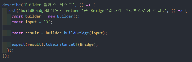 다리에 해당하는 Bridge 클래스를 만들어 다리 생성 기능을 구현한 뒤에 상황이다.