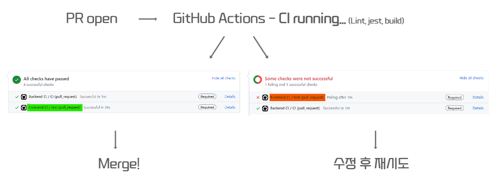 테스트를 통과하지 못했거나, 빌드가 실패하는 작업물을 merge하면 안되겠죠.