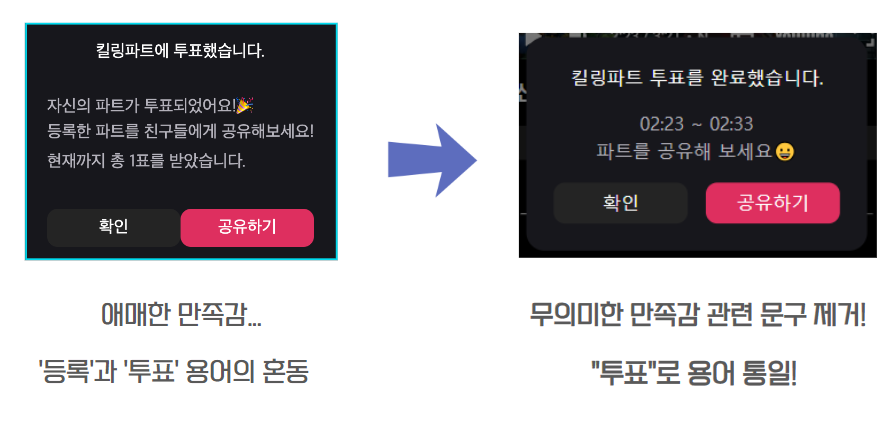 최종적으로 위 사진처럼 모달에서 애매한 만족감을 주는 문구를 삭제하였고, 용어를 통일했습니다.