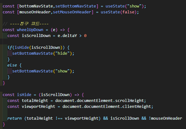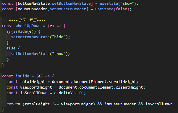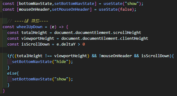 1. wheelUpDown 함수는 isHide(e) 값에 따라 bottomNav의 상태를 바꾸는 함수구먼...