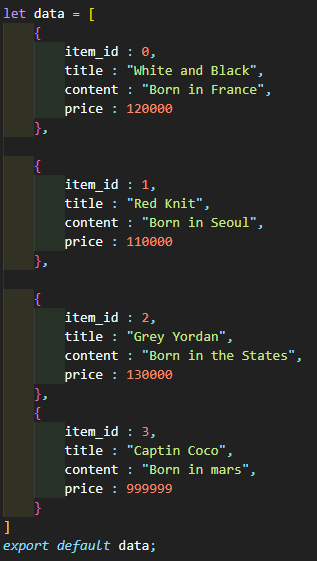 위에 사진보고 눈치 챈사람도 있겠지만 data 배열의 각 자료에 item_id 값이 0부터 차례대로 부여 되어있다.