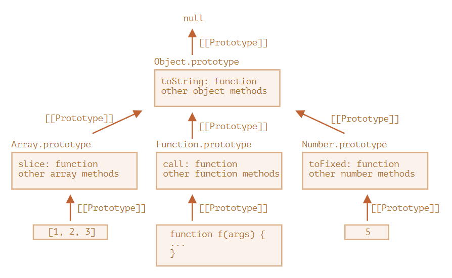 위 그림처럼 모든 내장 프로토타입 체인의 꼭대기에는 Object.prototype 이 있습니다.